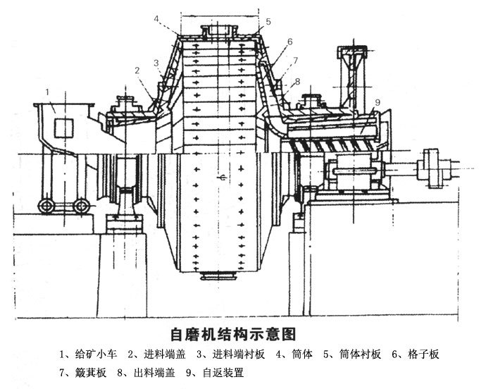 自磨機(jī)的特點(diǎn)是可以將原礦或經(jīng)過(guò)粗碎的礦石直接給入磨機(jī)。礦物按一定粒級(jí)配比給入磨機(jī)。自磨機(jī)可將物料一次磨碎到0.074mm,其含量占產(chǎn)品總量的20%~50%以上。粉碎比可達(dá)4000-5000,比球、棒磨機(jī)高十幾倍。自磨機(jī)是一種兼有破碎和粉磨兩種功能的磨礦設(shè)備。它利用被磨物料自身為介質(zhì),通過(guò)相互的沖擊和磨削作用實(shí)現(xiàn)粉碎。自磨機(jī)還被叫做無(wú)介質(zhì)磨機(jī)。