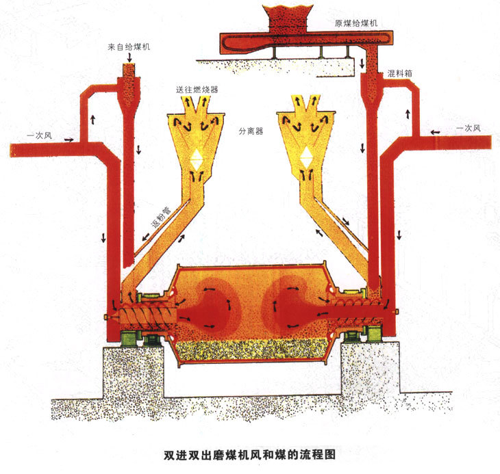 雙進(jìn)雙出磨煤機(jī)具有兩個(gè)對稱的粉磨回路,其工作原理如下: